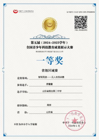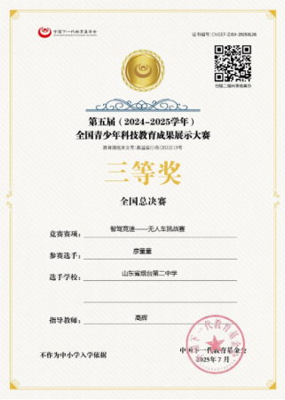 近日,第五屆全國青少年科技教育成果展示大賽總決賽在北京舉行,煙臺二中高2024級學子廖童童在大賽“智駕競速-無人車挑戰(zhàn)賽”項目中表現(xiàn)優(yōu)異,獲得全國總決賽三等獎。