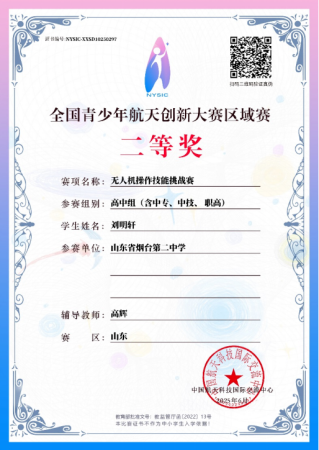 “崮立三線承紅志·少年逐夢探蒼穹”2025年全國青少年航天創(chuàng)新大賽山東省選拔賽在山東省臨沂市順利開賽。煙臺二中高2024級學子劉明軒在大賽“無人機操作技能挑戰(zhàn)賽”中表現(xiàn)優(yōu)異,獲大賽二等獎。