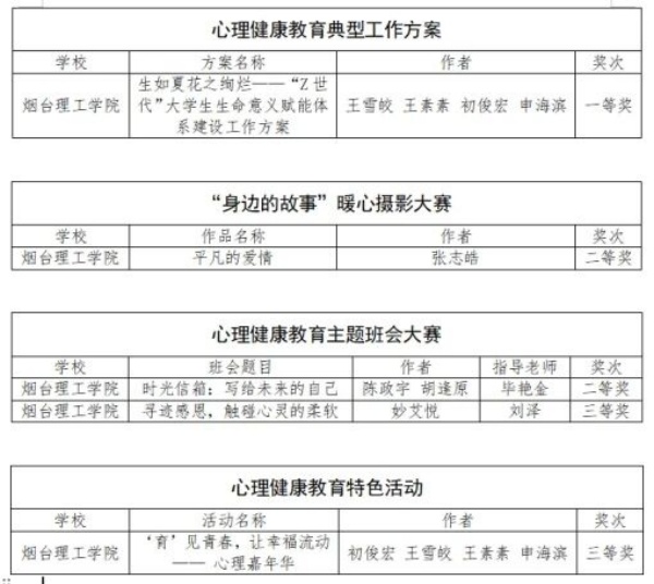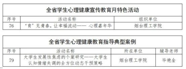 其中,由山東省教育廳主辦的評選活動中,煙臺理工學(xué)院教師在特色活動及典型案例中共斬獲2項獎項,在山東省大學(xué)生心理健康教育專業(yè)委員會組織的評選活動中,獲獎5項。