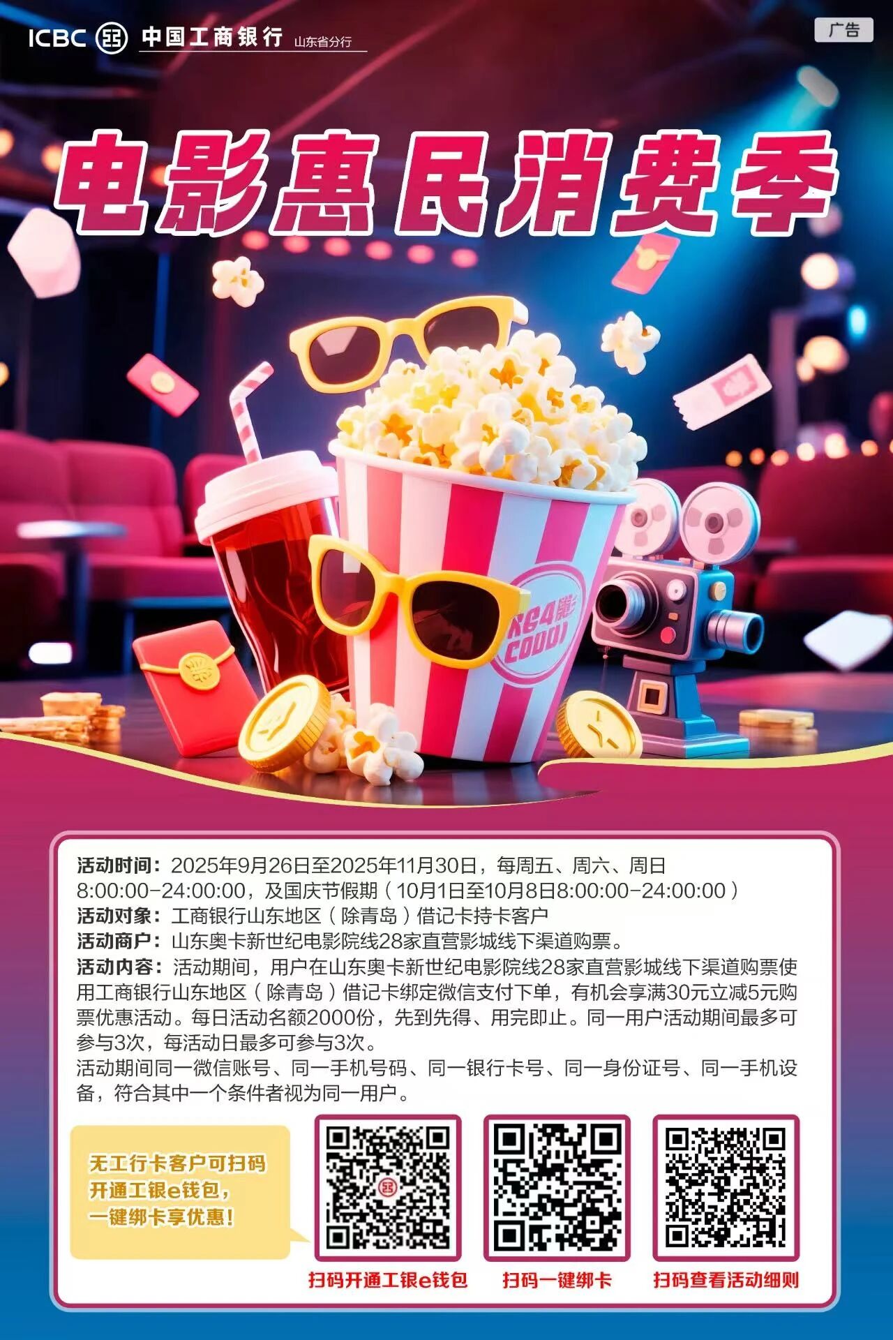 活動(dòng)內(nèi)容:活動(dòng)期間,用戶在山東奧卡新世紀(jì)電影院線28家直營(yíng)影城線下渠道購(gòu)票使用工商銀行山東地區(qū)(除青島)借記卡綁定微信支付下單,滿30元立減5元,單張影票滿35元立減10元
