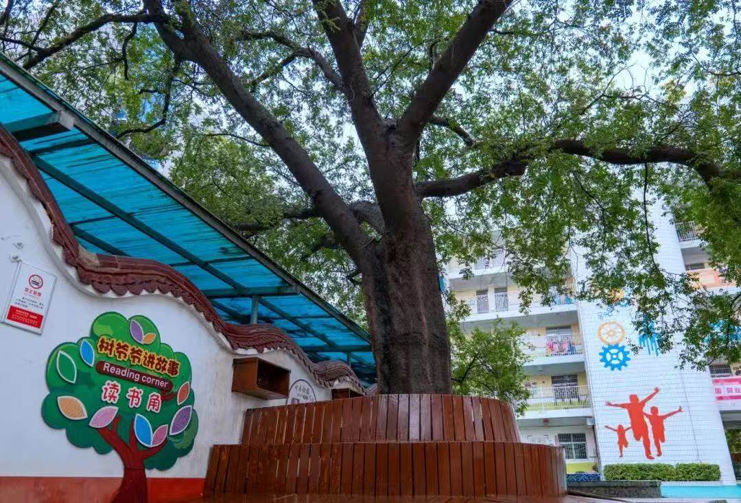 為了讓孩子們能夠和古樹親密接觸,學校在樹的周圍設置了步行的棧道,又圍著樹干做了一圈長凳,在樹邊的墻上放置了書架,200歲的古樹下,成了學生們的讀書角。