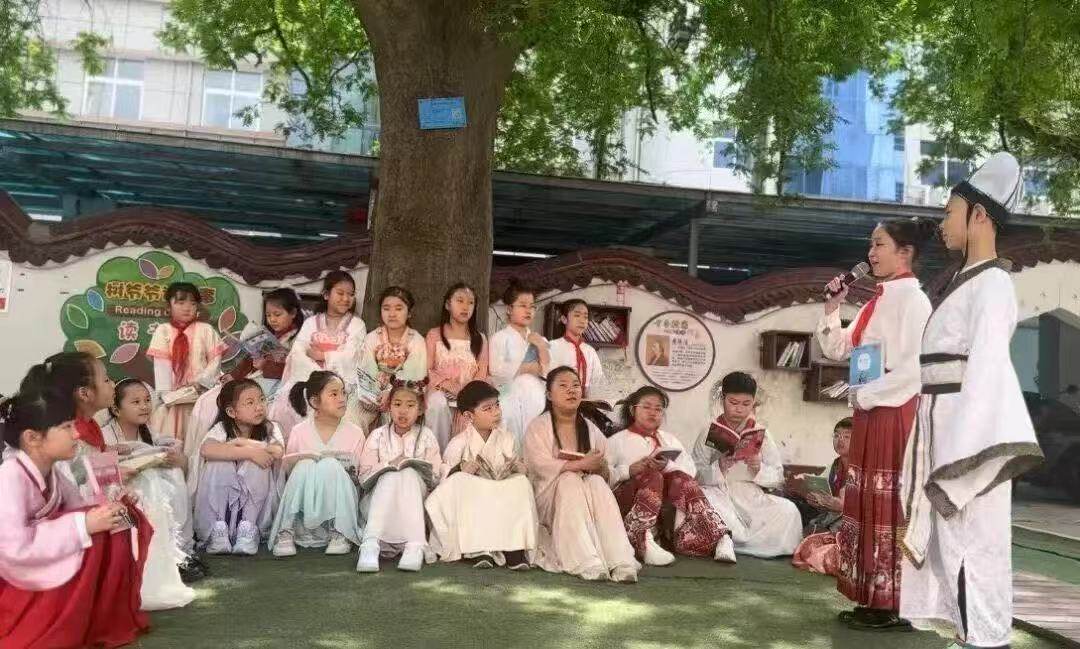 祁心怡是二年級時參加的“樹爺爺講故事”讀書分享會,“那是春天的時候,皂莢樹下的環(huán)境特別好,我本來還擔心分享的時候會緊張,不過當我站在皂莢樹下,自己很快就放松了下來,整個分享的過程很輕松也很快樂。”