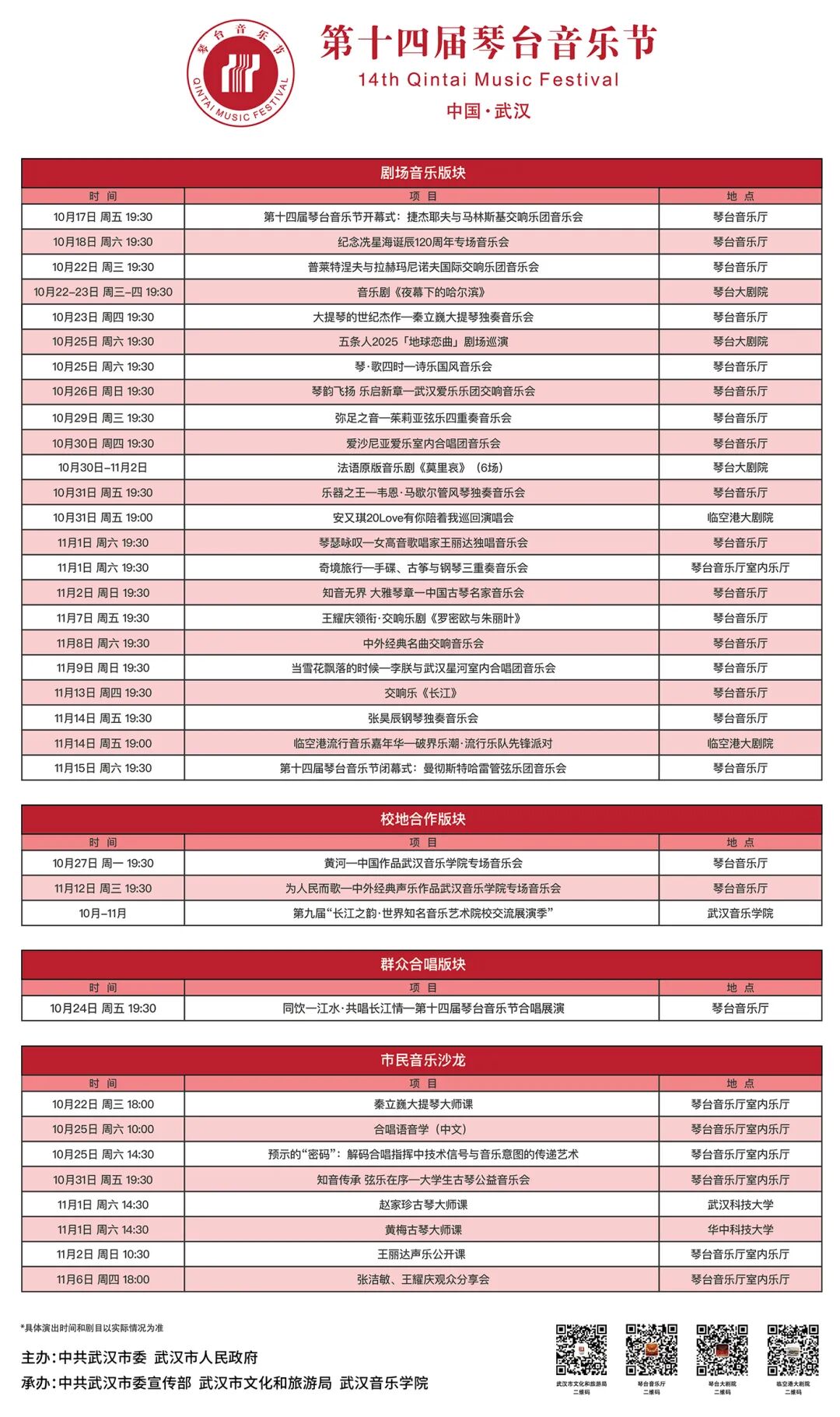 本屆琴臺(tái)音樂節(jié)將持續(xù)至11月15日,設(shè)有劇場(chǎng)音樂、群眾合唱、校地合作、市民音樂沙龍四大板塊。來(lái)自14個(gè)國(guó)家和地區(qū)的音樂家及演出團(tuán)體將通過(guò)線上線下相結(jié)合的方式,奉獻(xiàn)50余場(chǎng)高質(zhì)量演出。