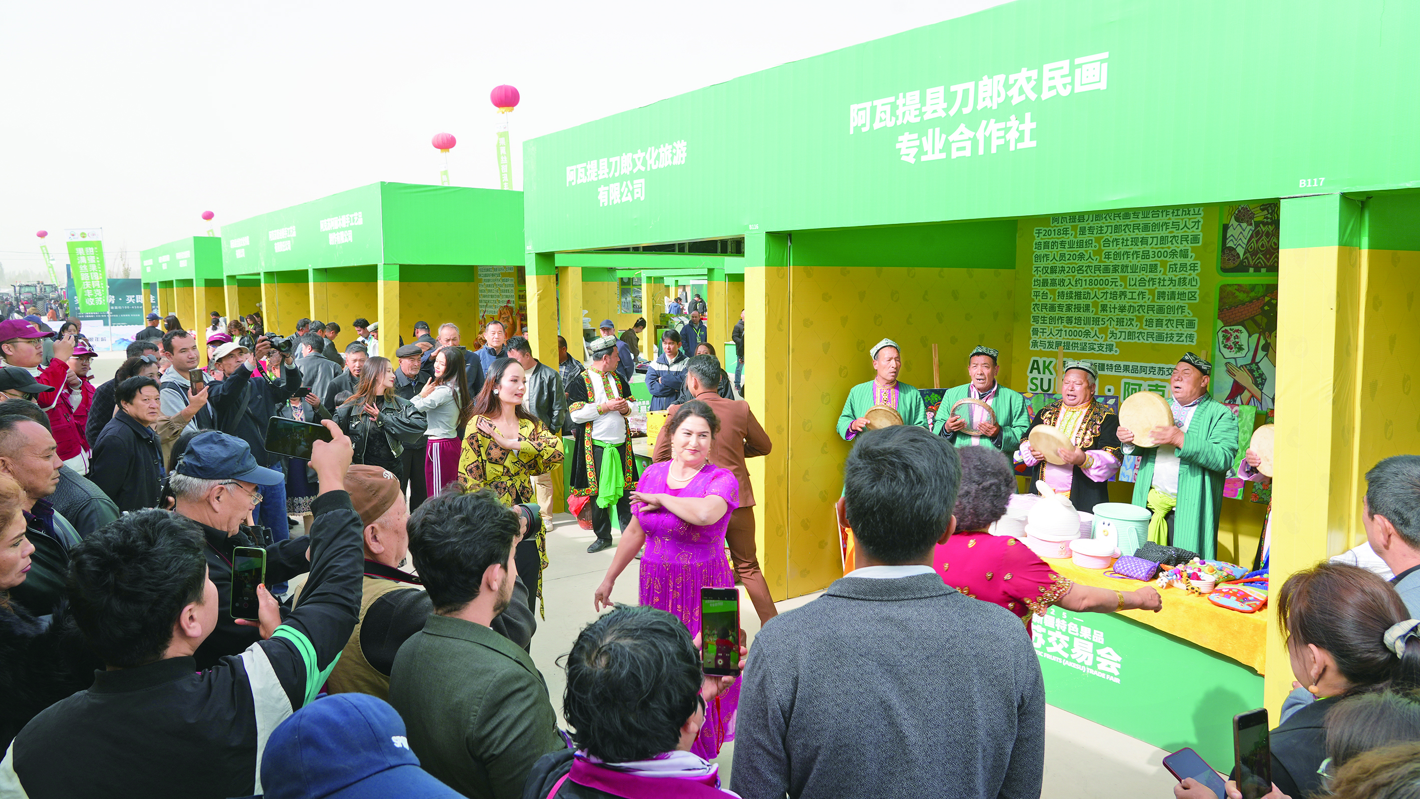 “咚!咚!咚!”伴隨著歡快的鼓點(diǎn),阿瓦提縣文旅產(chǎn)品展位前很快圍滿了觀眾。幾位老藝術(shù)家身著盛裝,表演熱情奔放的刀郎麥西熱甫,高亢歌聲與豪邁舞姿極具感染力,游客紛紛駐足觀看,不少觀眾還跟著旋律加入舞蹈隊(duì)伍。表演結(jié)束后,大家意猶未盡,又被展區(qū)內(nèi)獨(dú)具特色的非遺產(chǎn)品吸引,仔細(xì)欣賞或購(gòu)買(mǎi)民族服飾、手工刺繡包等商品。
